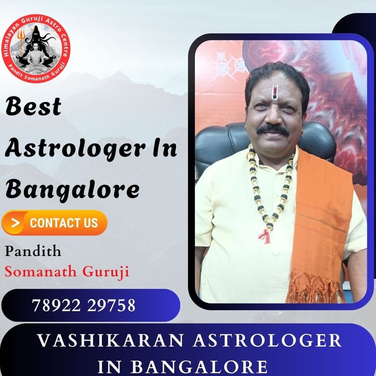 Welcome to the Himalayan Guruji Astro Centre, home of one of the most trusted and experienced astrologers in Bangalore – Pandith Somanath Guruji. With decades of expertise in astrology, Vashikaran, and spiritual solutions, Guruji is well-known for providing accurate predictions and powerful remedies to individuals facing challenges in love, marriage, business, family, and personal life. Astrological Expertise That Guides You Right Pandith Somanath Guruji blends ancient Vedic knowledge with years of practical experience. His deep understanding of planetary movements, horoscopes, and birth charts enables him to offer precise guidance that empowers people to take control of their lives. Whether you’re dealing with personal dilemmas, relationship issues, or professional setbacks, Guruji offers authentic solutions tailored to your unique situation. Trusted Vashikaran Specialist in Bangalore Specializing in Vashikaran, Guruji provides effective and ethical solutions that aim to restore harmony in relationships and overcome emotional blocks. Vashikaran techniques offered here are rooted in spiritual practices and are designed to bring positive energy and alignment between partners, family members, or colleagues. Services Offered: Horoscope Reading & Analysis Marriage & Relationship Compatibility Career and Job Guidance Vashikaran Remedies Financial and Business Astrology Health and Wellbeing Astrology Negative Energy Removal Kundli Matching and Dosha Remedies Why Choose Pandith Somanath Guruji? 30+ Years of Experience Confidential and Personalized Consultations Genuine Astrological Solutions Trusted by Thousands Across India Available Online and In-person Multilingual Support (Kannada, Hindi, English, Telugu) Serving Bangalore’s Key Areas: Guruji offers services across all major localities including Rajajinagar, Jayanagar, Indiranagar, Whitefield, Koramangala, Yelahanka, Kengeri, BTM Layout, Malleshwaram, and Electronic City. If you’re looking for a positive transformation in your life through spiritual insight and time-tested remedies, connect with Pandith Somanath Guruji today. Every consultation is confidential, empathetic, and directed toward helping you achieve peace, success, and happiness. 📍 Visit the Himalayan Guruji Astro Centre or call to schedule your consultation.